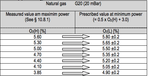 Determining the correct setting of O2 at minimum output for natural gas G20